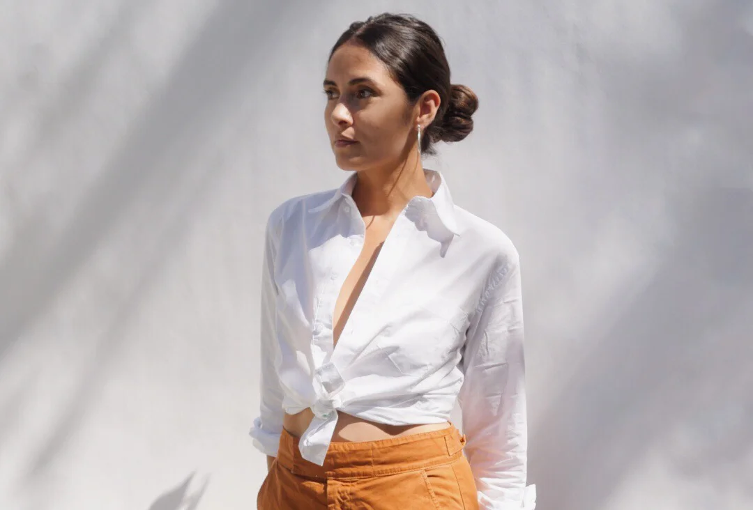 Look 1 Classic White Button Down by Eight + Sand, High Rise repurposed Levis jeans by Re/Done, Ophelie in Cognac by Behavior LA, Orbit Studs in Sterling Silver and Red Jasper by I Like It Here Club. Look 2 Stone Twill Button Down by Eight + Sand, Elizabeth Wayfarer by Imogene + Willie (similar here), hat by Cylde, Ophelie in Cognac by Behavior LA. Look 3 Classic White Button Down by Eight + Sand, Uniform Trouser in Maple by Lacausa, Xena Hoops in Sterling silver by I Like It Here Club. Look 4 Stone Twill Button Down by Eight + Sand, The Grace dress by Sugar Candy Mountain, Prosperity Mala necklace by Nala Malas, Pretty Hippy Necklace by Whitney Shelhamer.