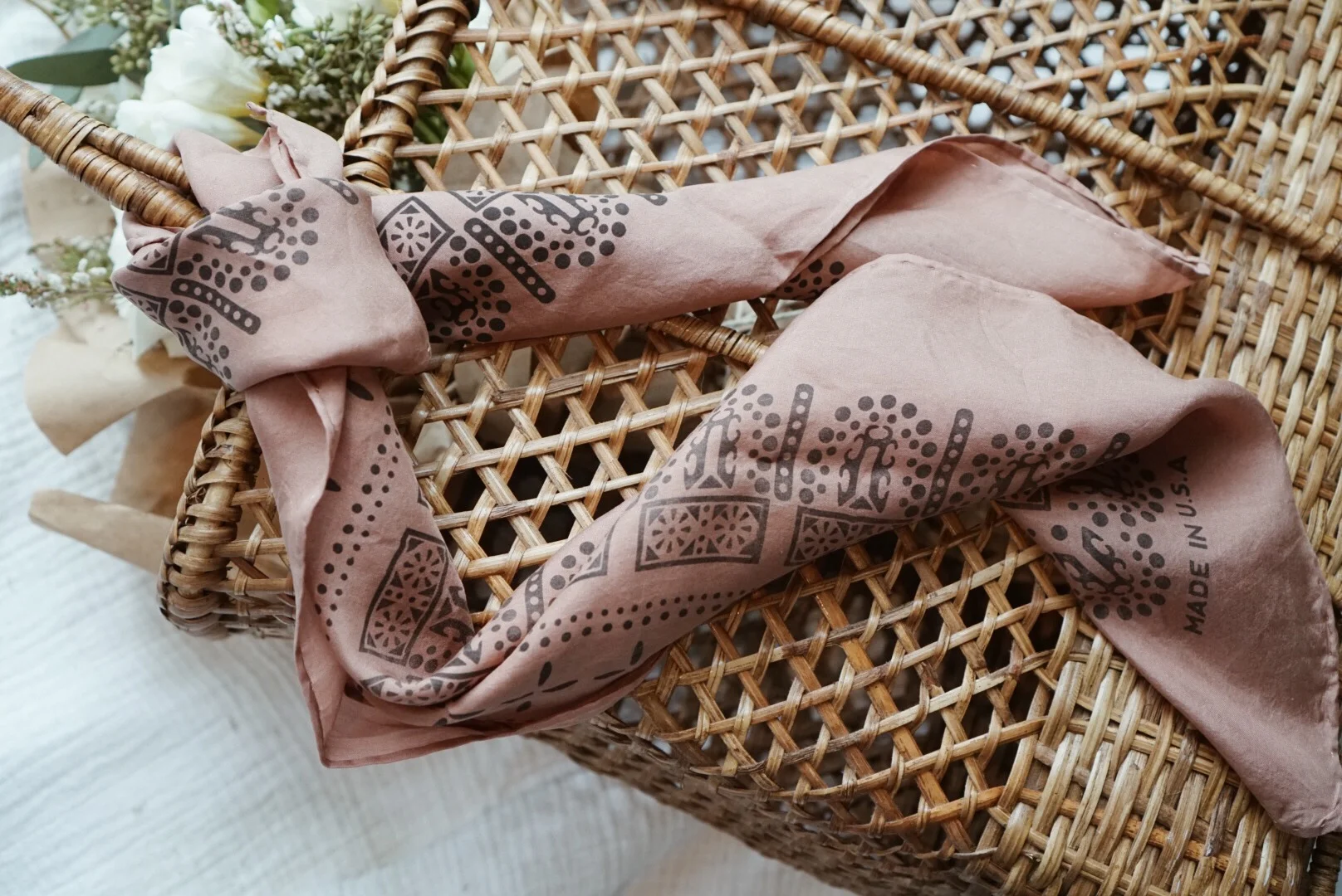 Ozma of California 1930's Bandana in Sand 100% silk hand printed + dyed in LA retails for $82 www.ozmaofcalifornia.com + @ozma_of_california.